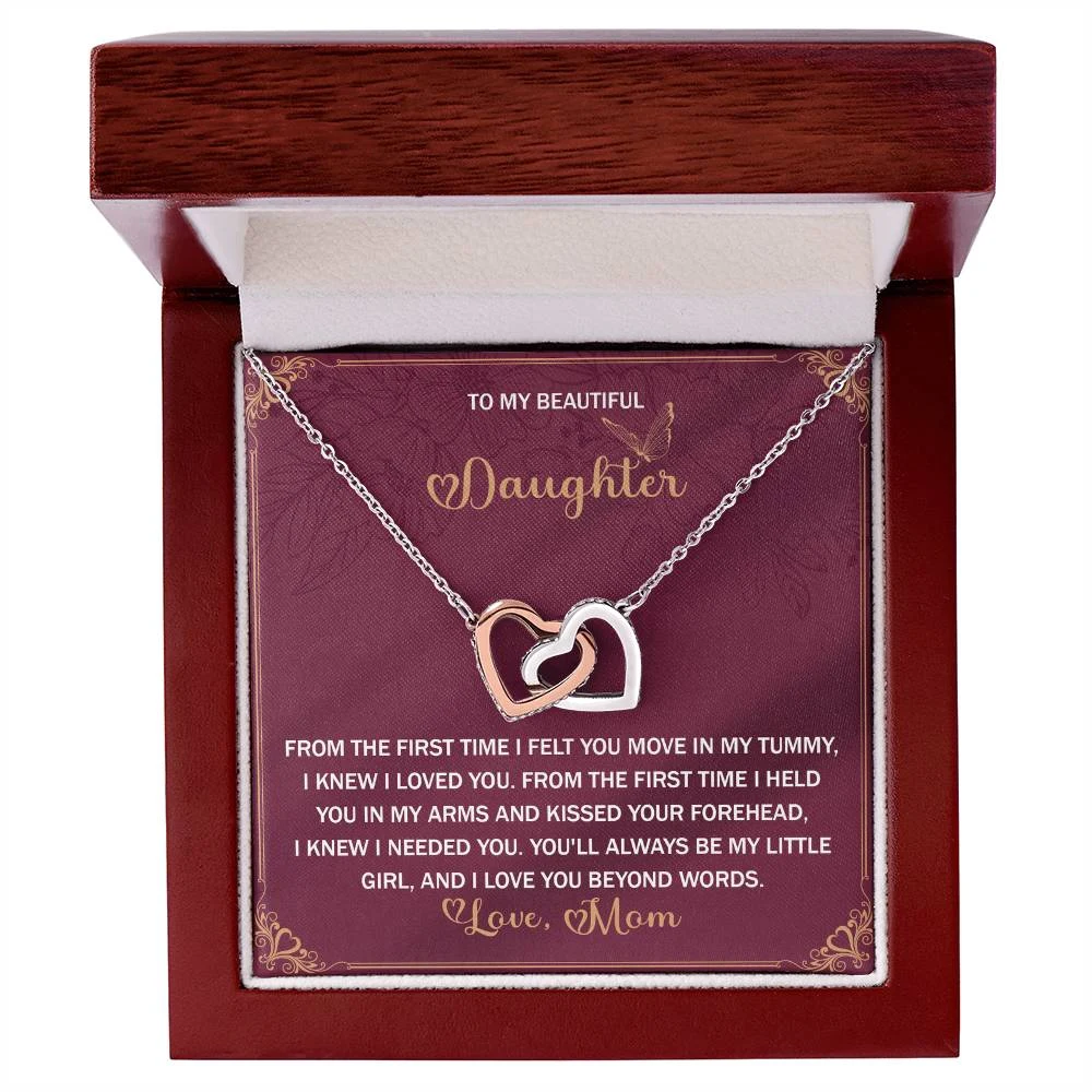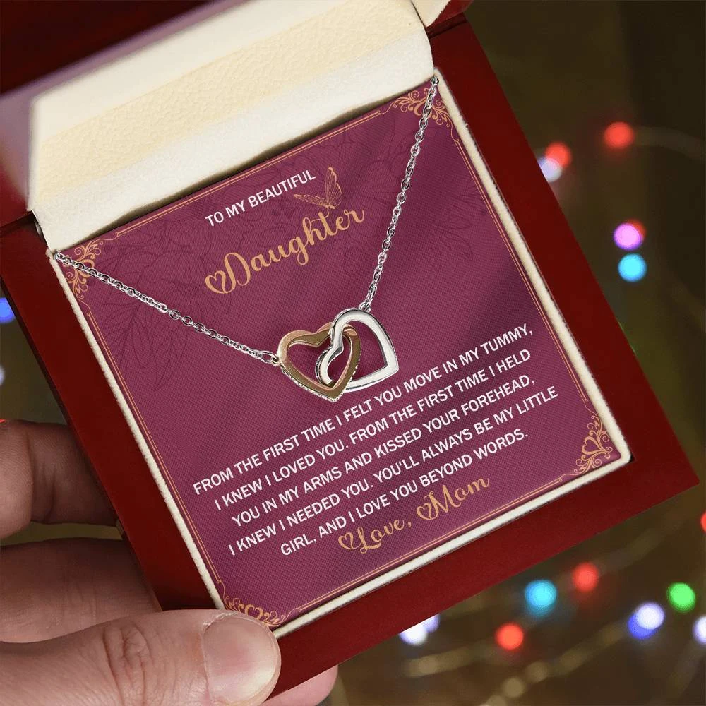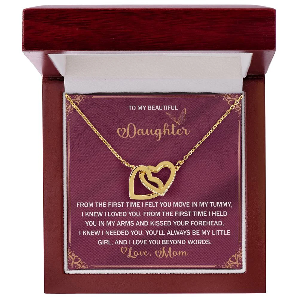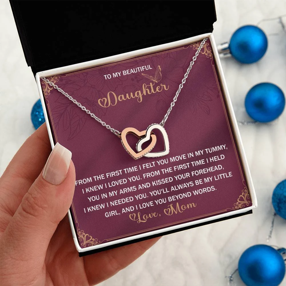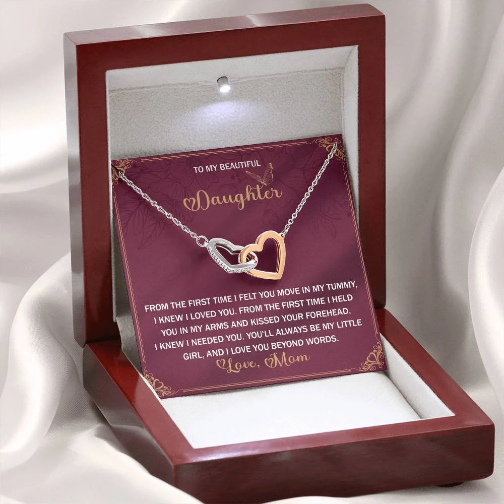 Interlocking Hearts – A Symbol of a Parent’s Endless Love ❤️ Two hearts, forever linked — just like the unbreakable bond between parent and child.. Featuring two lovely hearts embellished with cubic zirconia crystals, this Interlocking Hearts necklace is the perfect accessory for everyday wear. This elegant necklace is more than a gift — it’s a daily reminder that no matter where life leads, your heart is always with them.