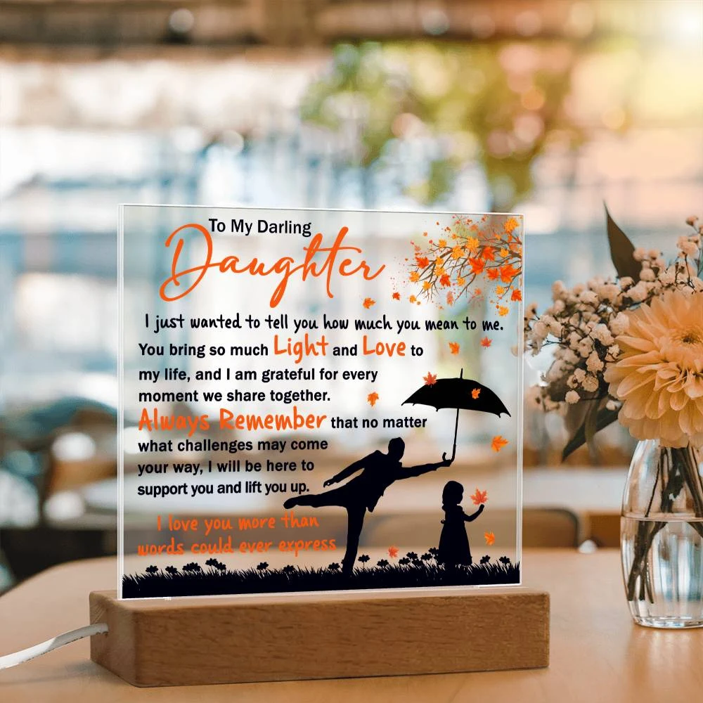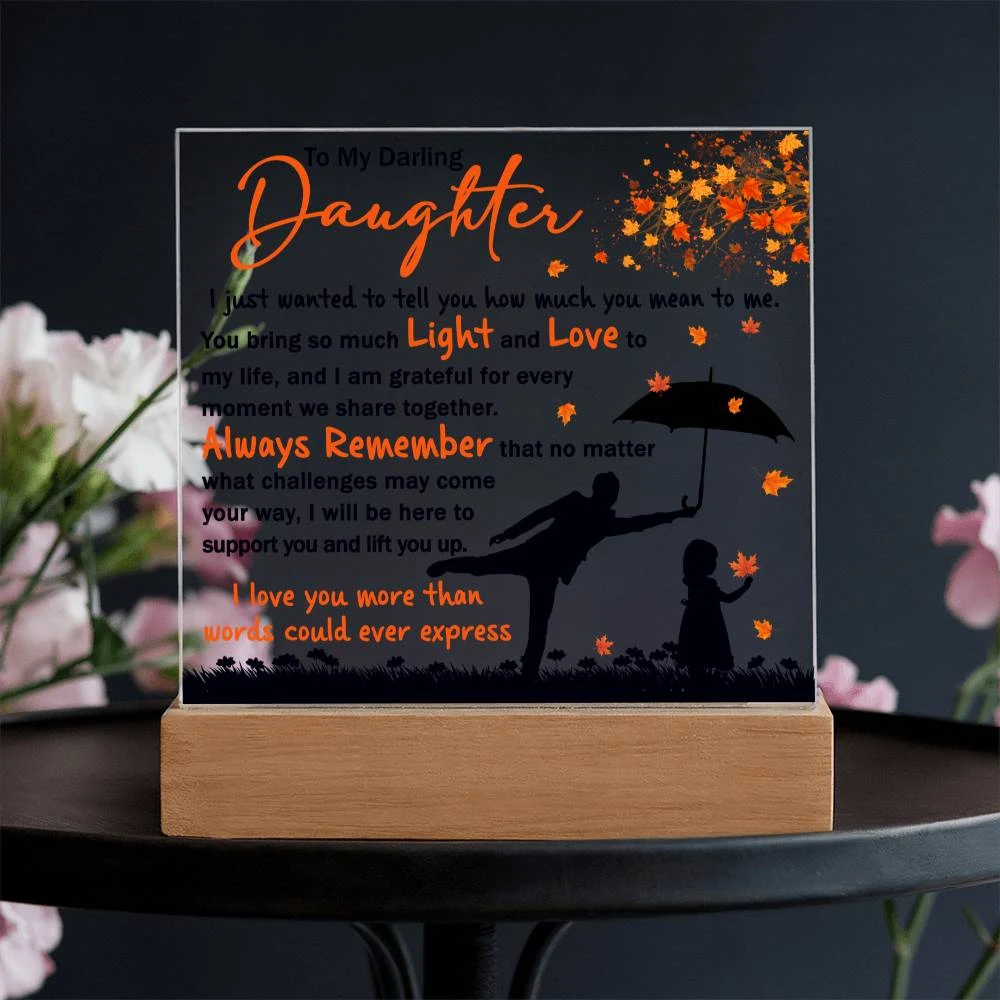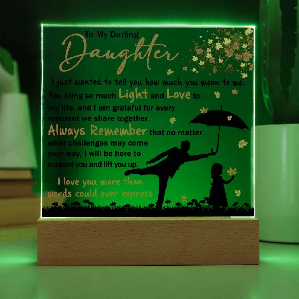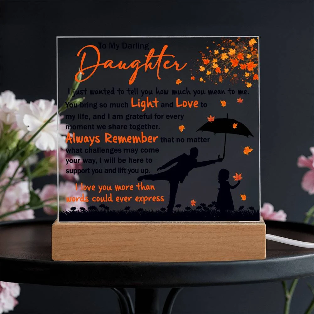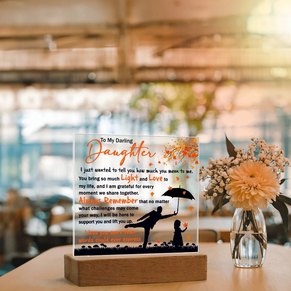 Your plaque will be crafted from premium acrylic with a professionally printed design for a polished look. It comes with a stylish wooden LED base, and you can choose between a USB plug-in option OR a cordless battery-operated option (requires 2 AAA batteries, not included). Both LED bases feature 7 vibrant colors, allowing the user to customize the lighting with various color changes and dynamic cycles.