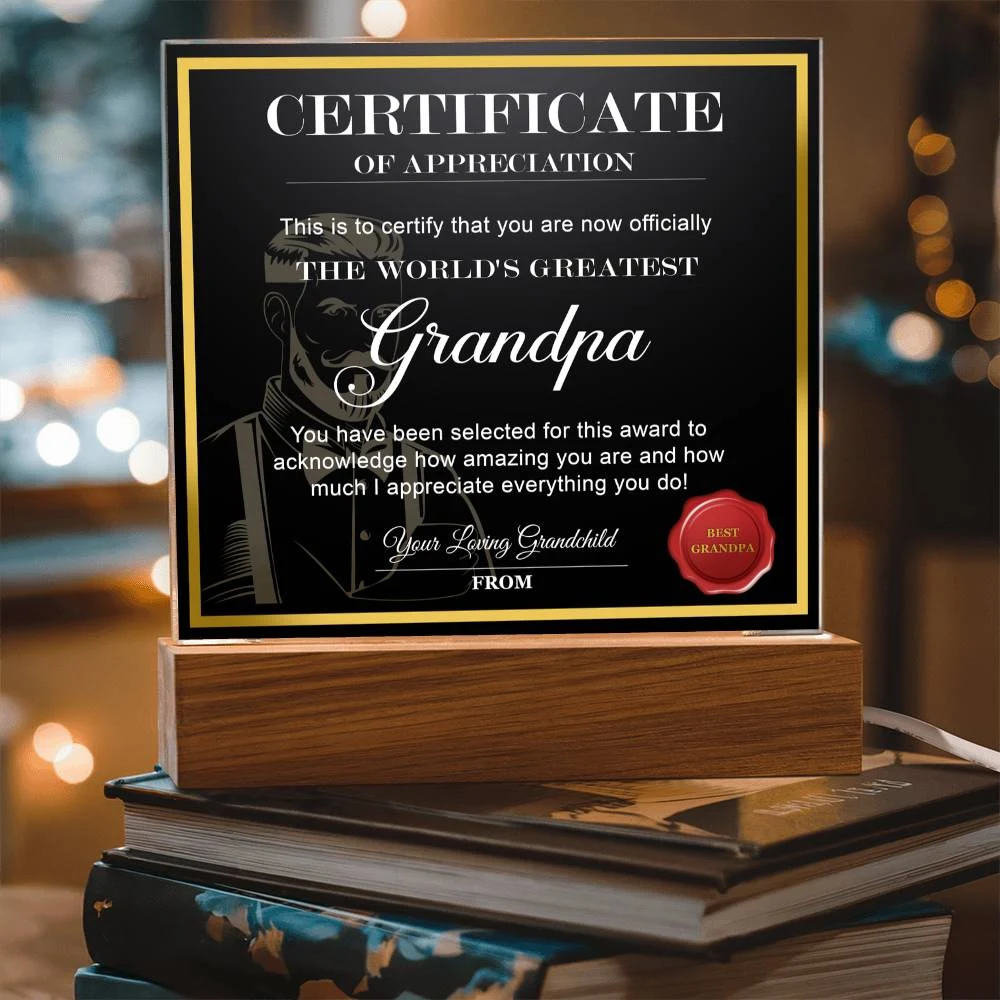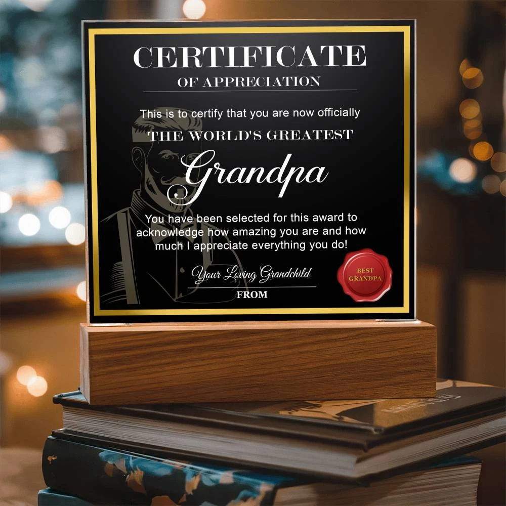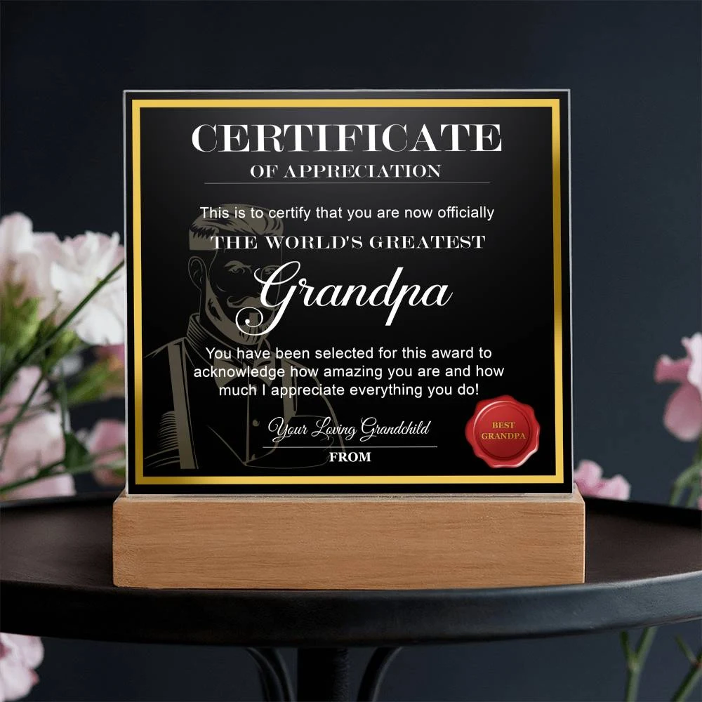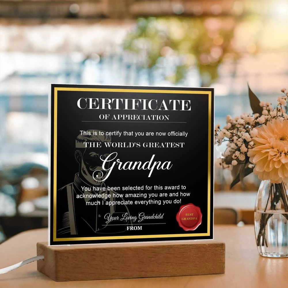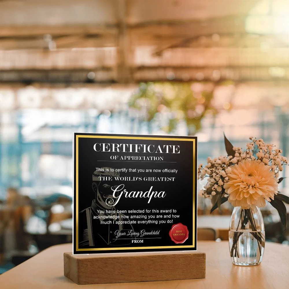 Your plaque will be crafted from premium acrylic with a professionally printed design for a polished look. It comes with a stylish wooden LED base, and you can choose between a USB plug-in option OR a cordless battery-operated option (requires 2 AAA batteries, not included). Both LED bases feature 7 vibrant colors, allowing the user to customize the lighting with various color changes and dynamic cycles.